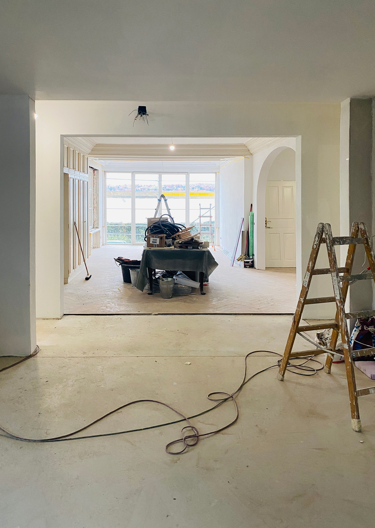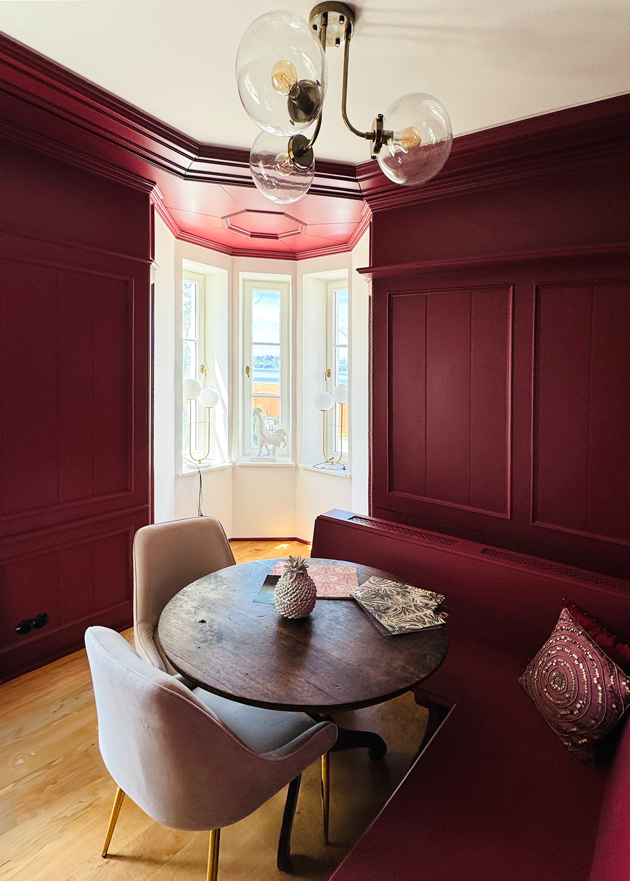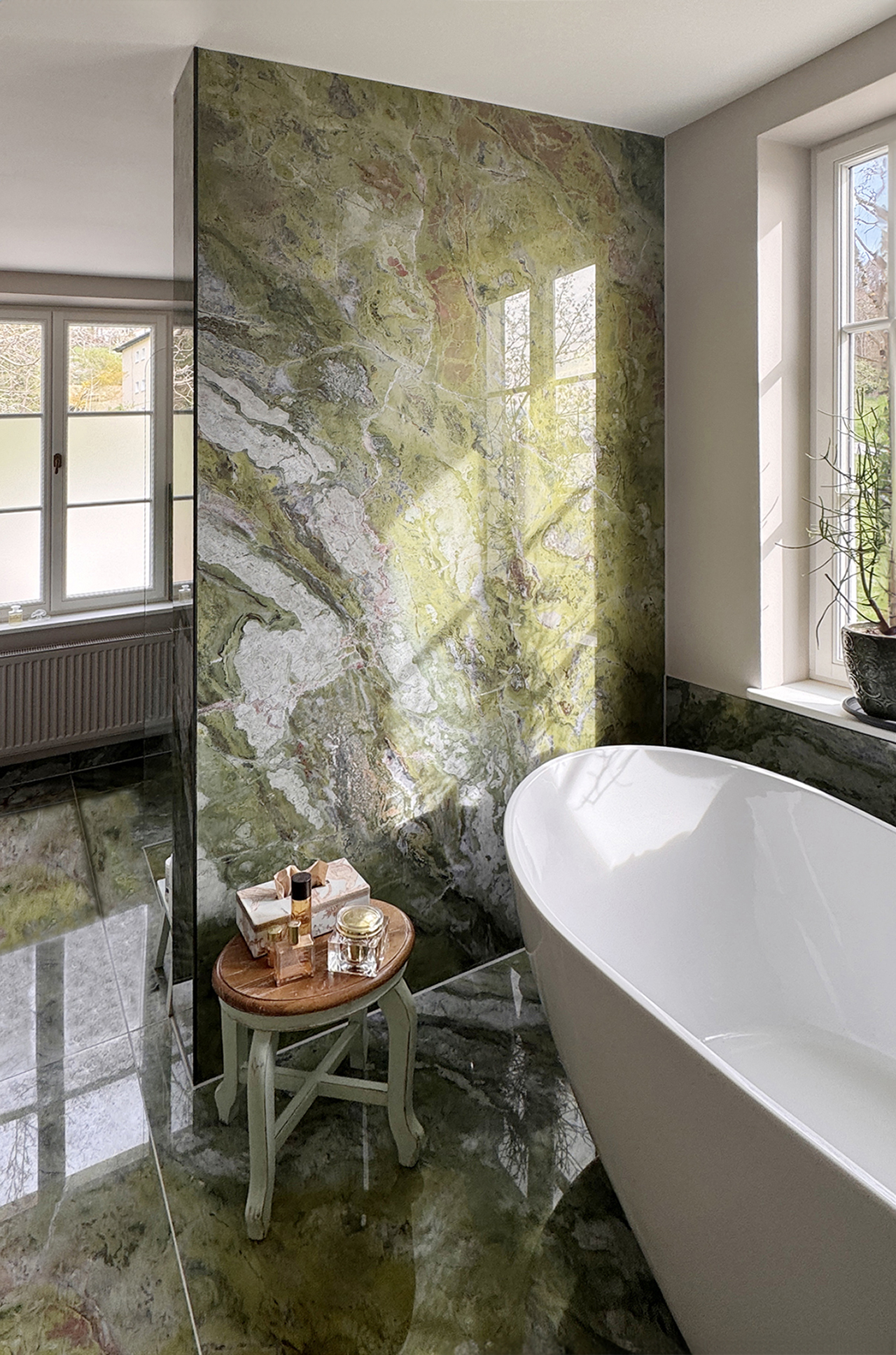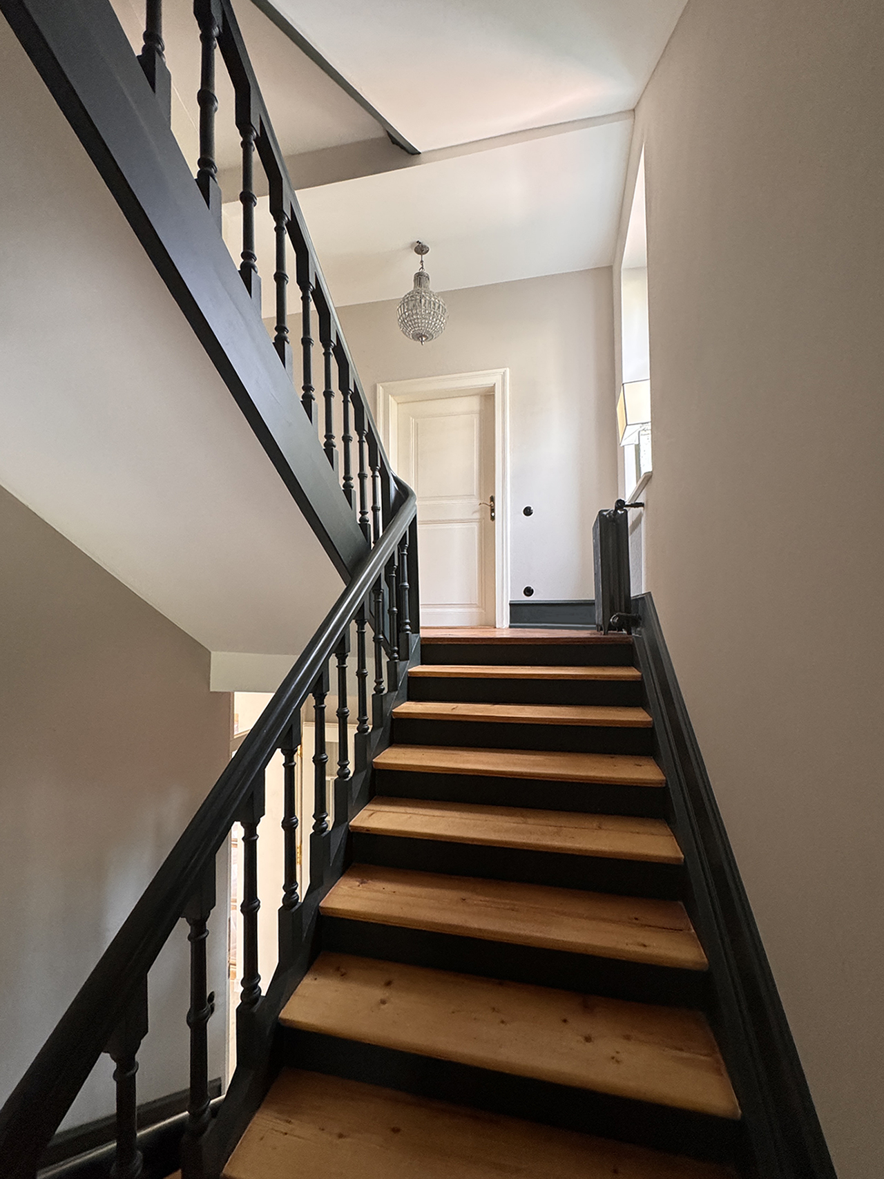 Der Innenausbau wurde von der Eigentümerin, selbst Innenarchitektin, mit besonderem Feingefühl und gestalterischer Klarheit geplant. Glastüren und sorgfältig gesetzte, lichtdurchflutete Fenster schaffen eine hohe räumliche Qualität und lassen Innen- und Außenraum visuell ineinander übergehen. Die klassische Raumaufteilung der oberen Geschosse war ideal für das Familienhaus und wurde nur durch geringfügige Veränderungen den zeitgemäßen Wohnvorstellungen angepasst